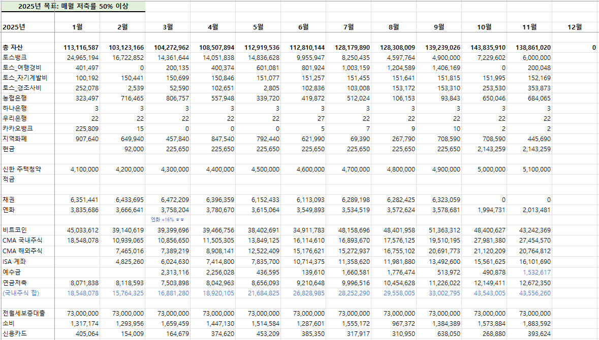 현금은 달러나 엔화 등 기축통화도 모으고, 한화로도 가지고 있다가 주식이나 코인이 많이 떨어지면 추가매수를 했어요.